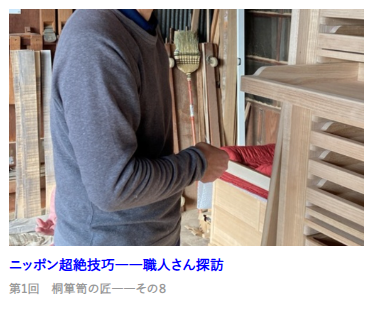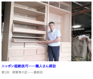 光栄なことに、第一回連載の「第1回 桐箪笥――日本の風土が生んだ世界最高の箪笥」で当社が紹介されました。職人としての想いや技術について、詳しくご紹介いただいておりますので、ぜひご覧ください。