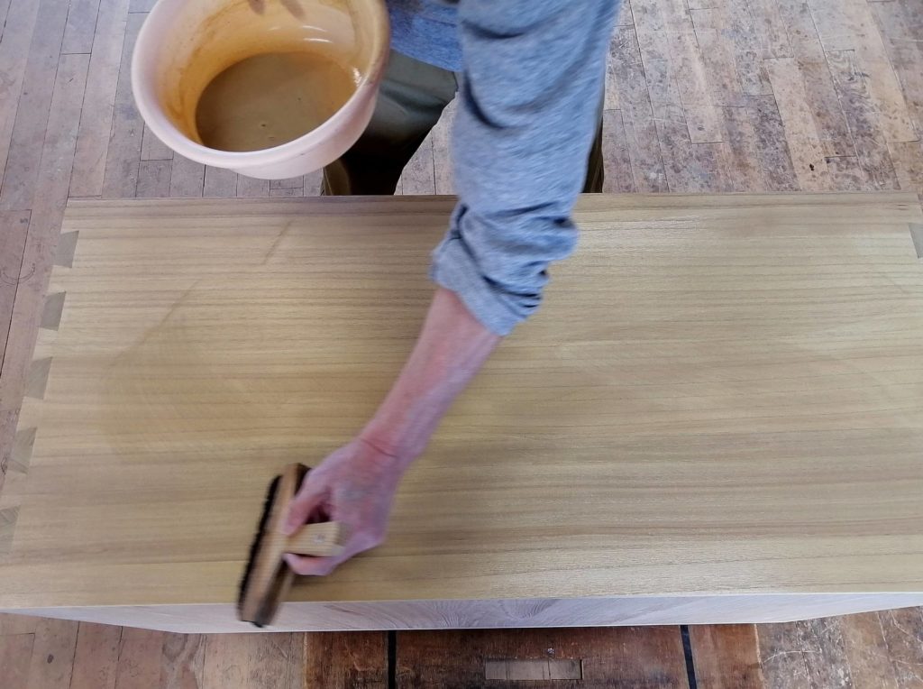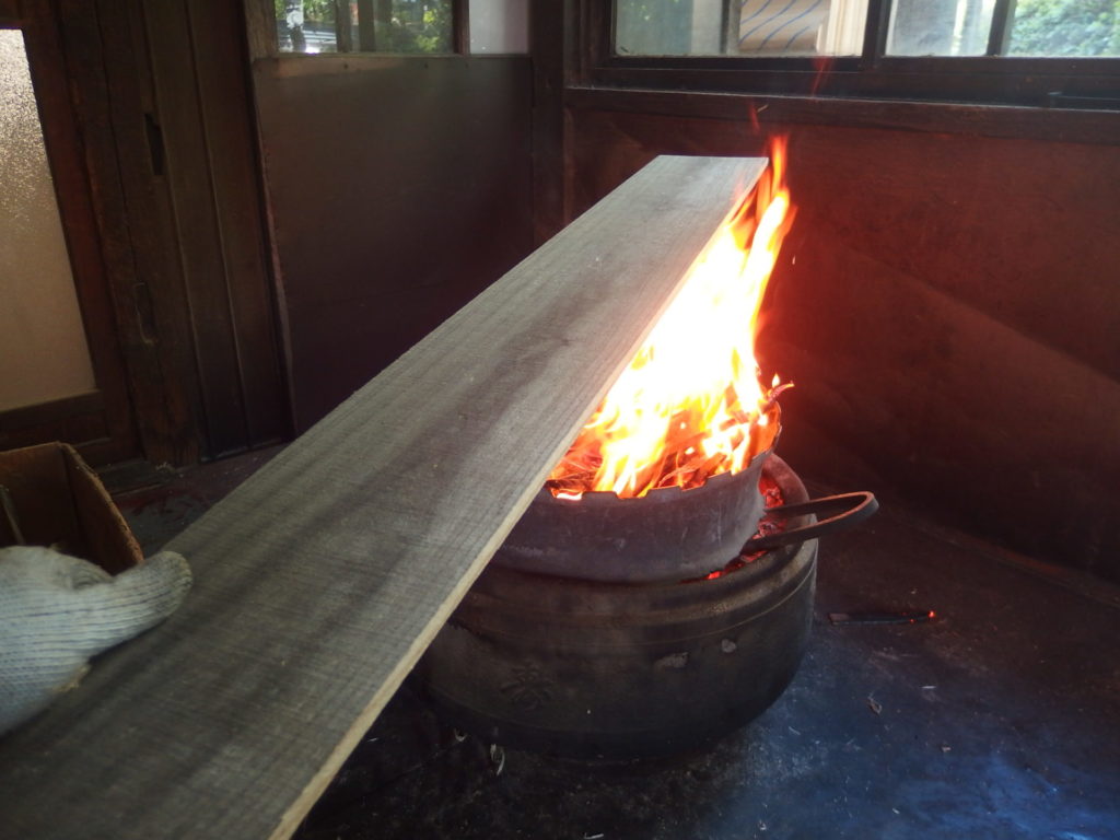 砥の粉と※ヤシャの実の煮汁を混ぜたものを塗り、金具を付けて完成になります。綺麗な木目が出るように着色するのが、ポイントです。