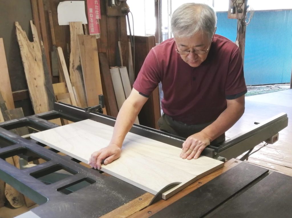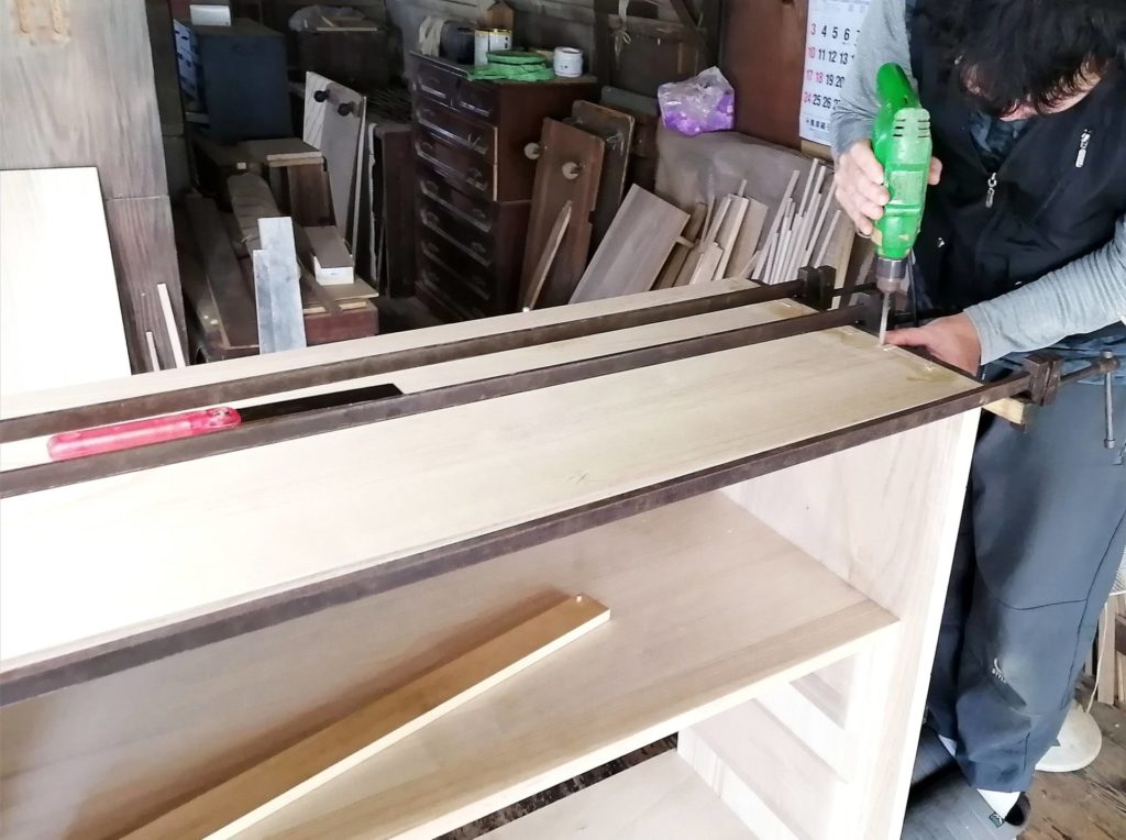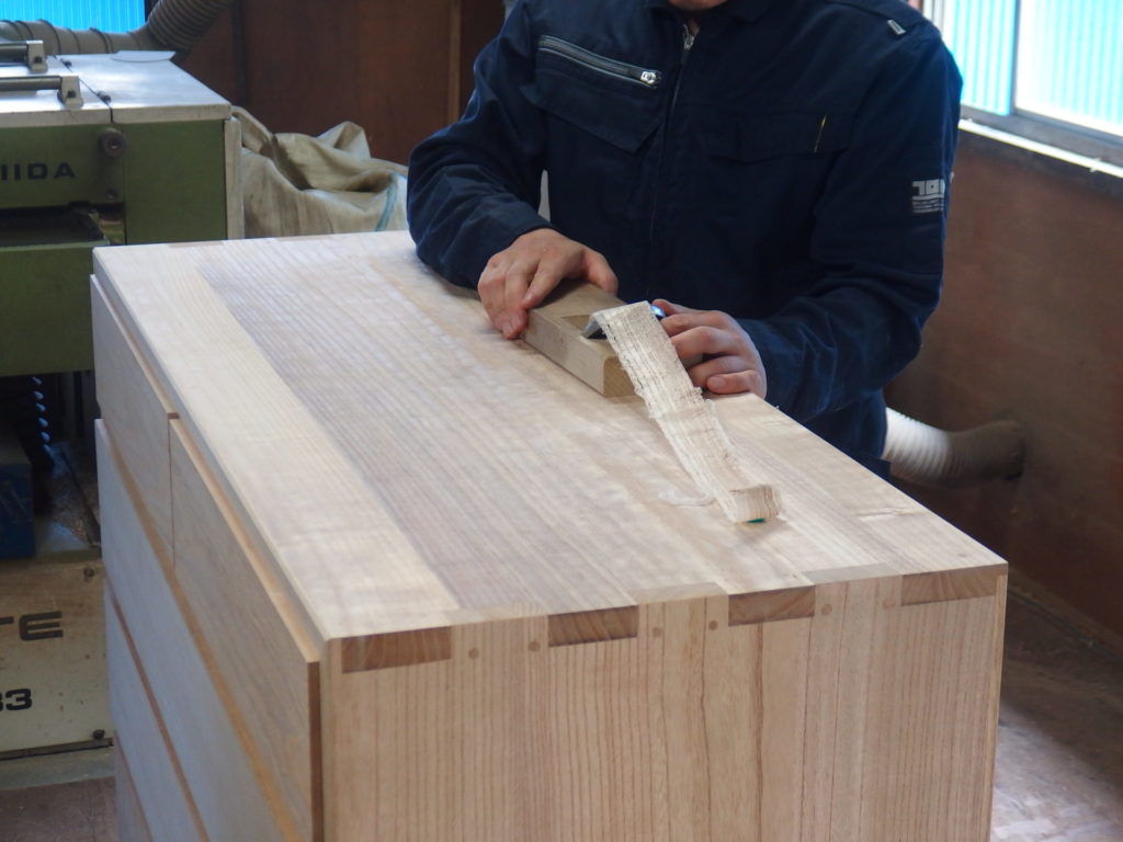 抽斗は少しずつ削りながら、本体に仕込みます。桐タンス職人の腕の見せ所です。本体に出し入れしながら、少しずつ削り合わせます。