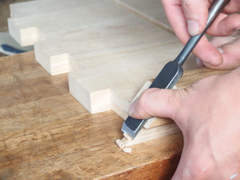 板と板の接合部の組手を加工します。細かい作業で熟練の技が要求されます。